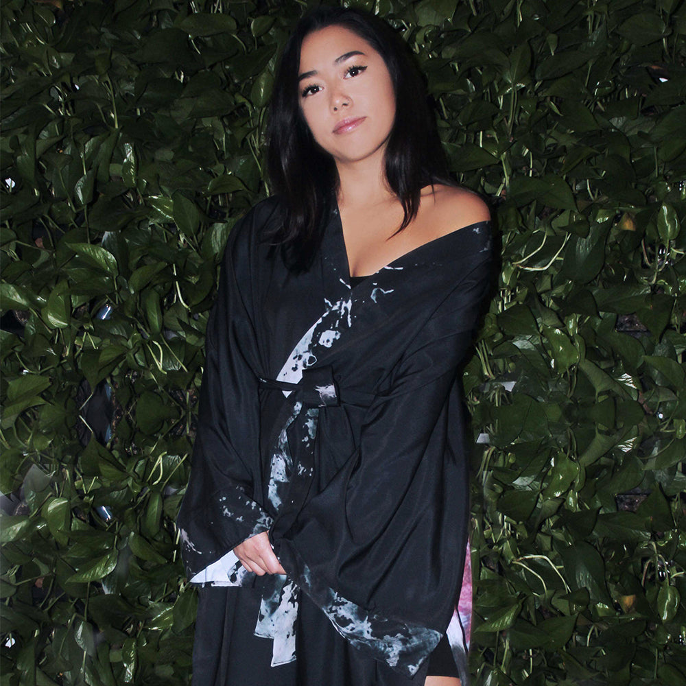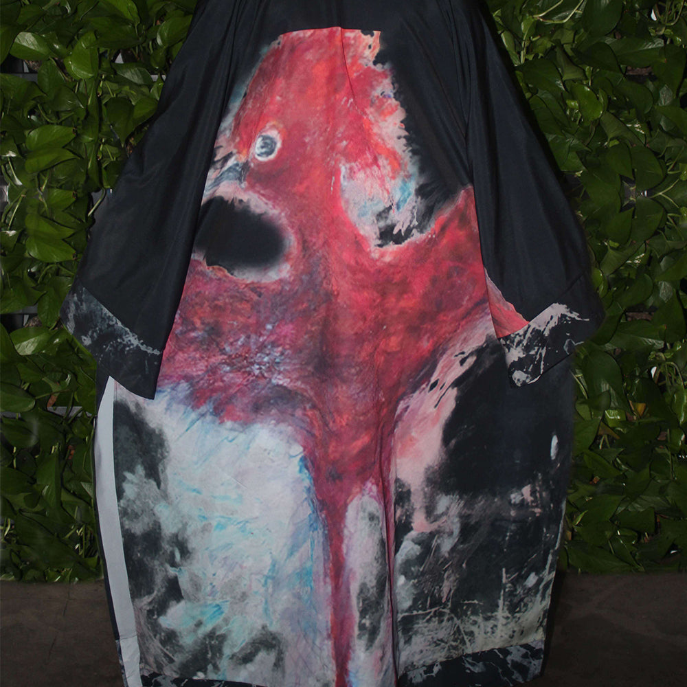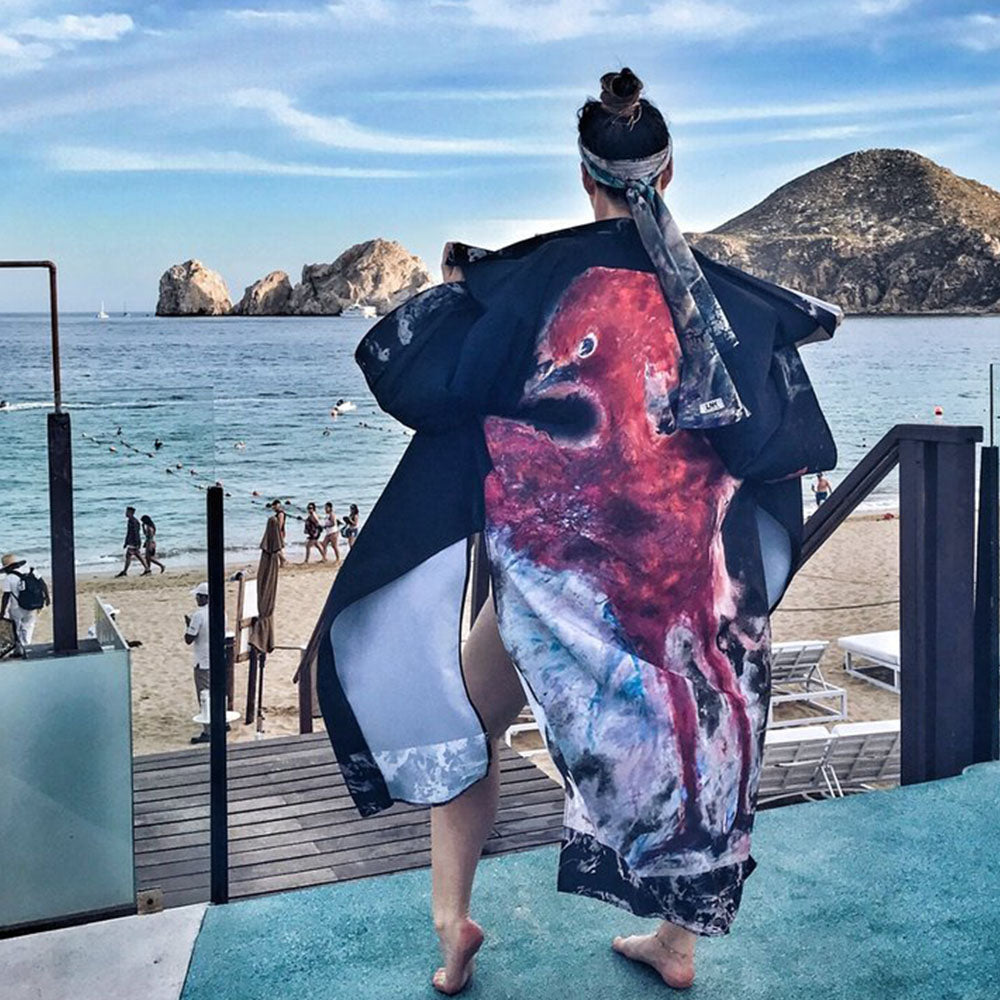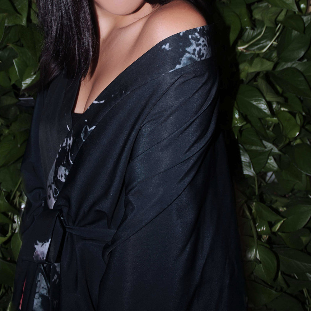 This floor length kimono is both beautiful and glamorous with paint brush contrast collar and sleeve. Use it as a cover up during the day or a bold statement for the night. It is our most popular kimono! Get it while we have it in stock or wait your turn!