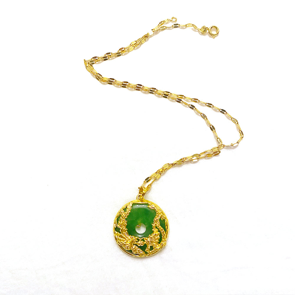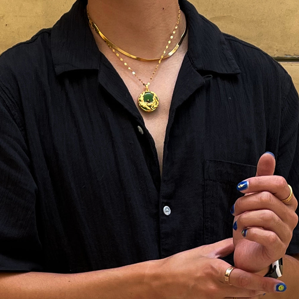 How can you be with this unique pendant featuring a dragon and phoenix design in gold to protect what matters the most, your heart energy. Jade is also known to attract good luck and friendship. The perfect piece for our collaboration with Ellie Lee.